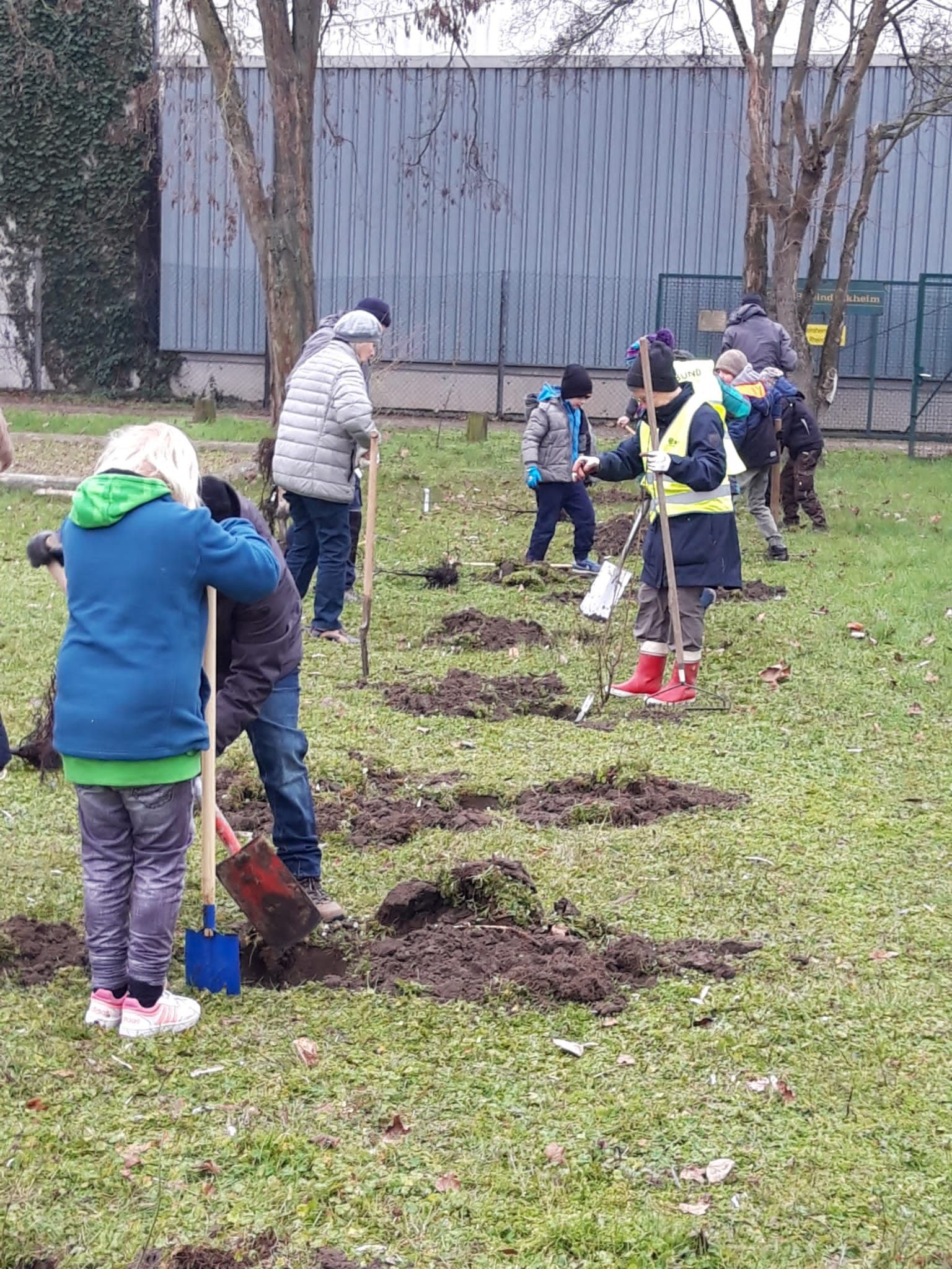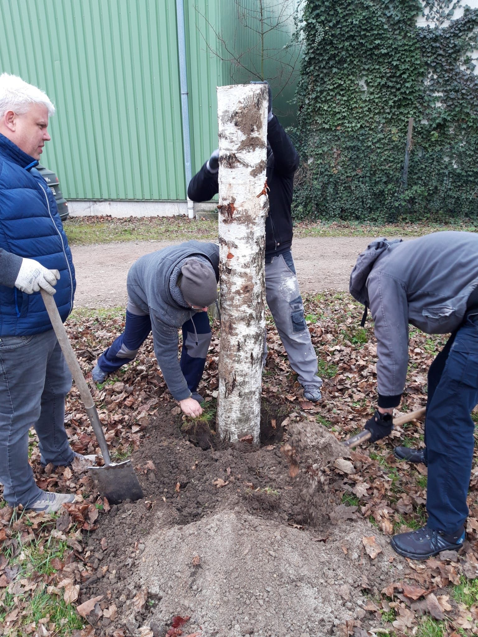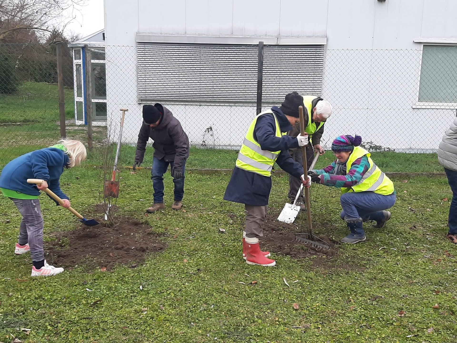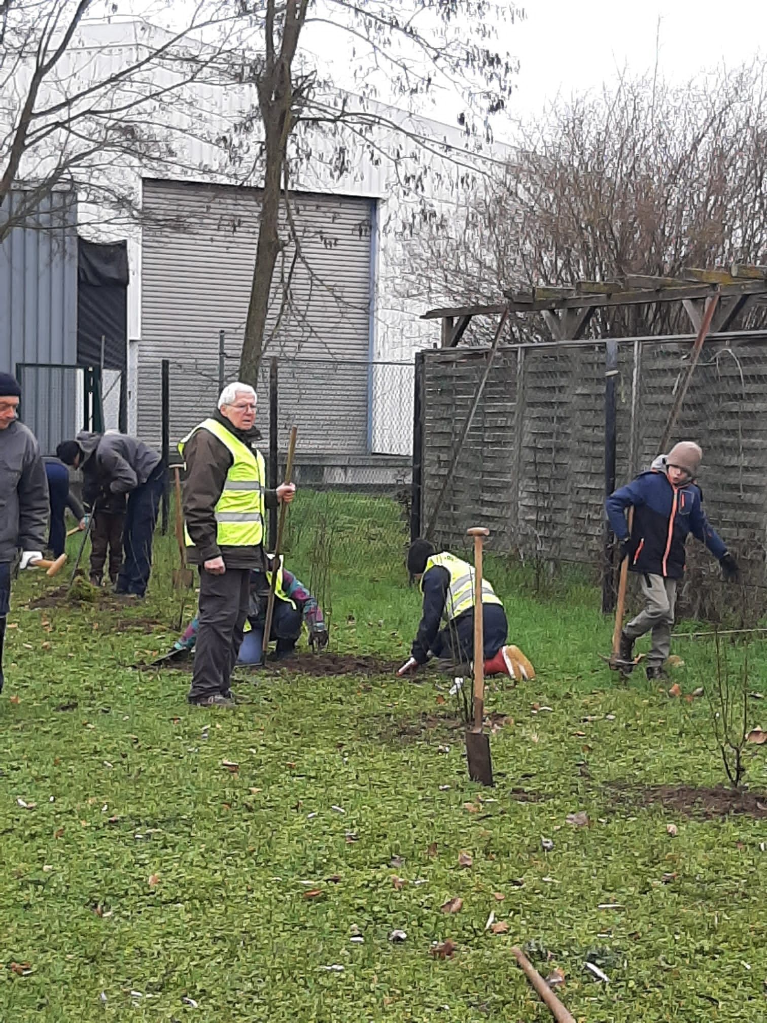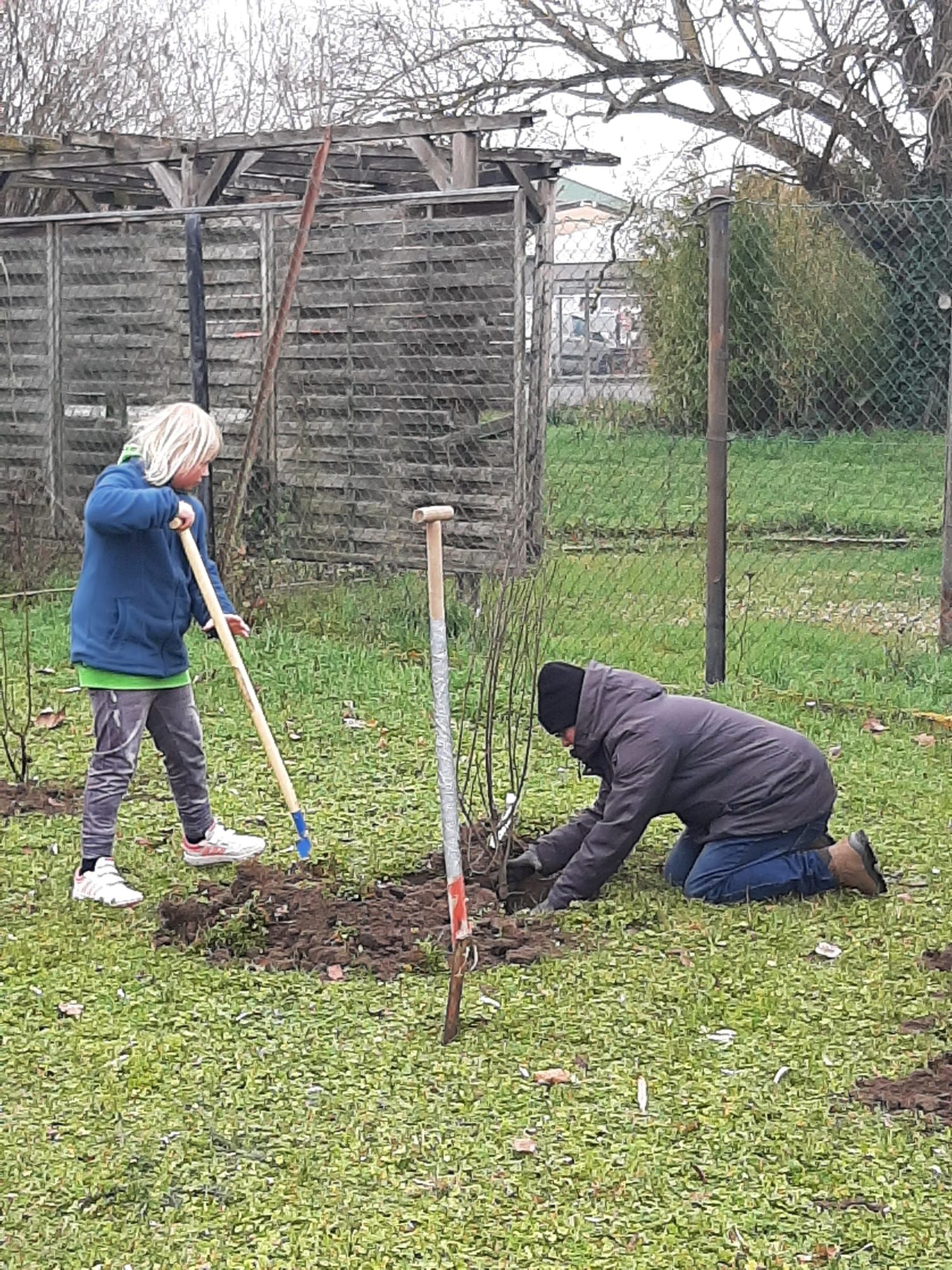 Hierzu haben wir auf der großen Wiese am Klubhaus auch etliche Sträucher gepflanzt, und zwar hinten am Zaun entlang, vom Eingangstor bis rüber zum Kompost- und Grünschnittablageplatz. Dort haben wir zudem einen Totholzhaufen angelegt, der Igel eine Unterschlupf- und Winterschlafmöglichkeit bieten könnte. Außerdem haben wir zwei Baumstämme in den Boden gesetzt und Löcher gebohrt, damit Insekten dort in ihr Hotel einziehen können.
