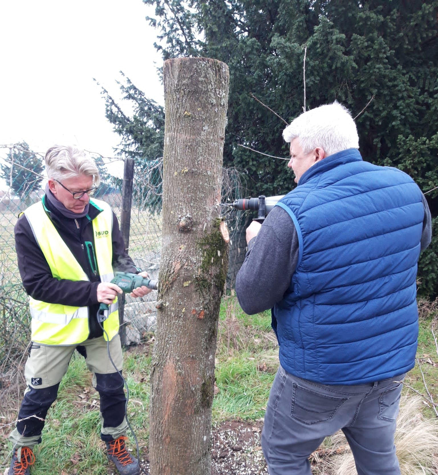 Um den Gartenschläfer zu retten, hat der BUND einen Hilfsfonds aufgelegt, den wir jetzt erfolgreich angezapft haben. Sprich: Der Umweltverband hat uns alle geschilderten Maßnahmen finanziert. Doch dem noch nicht genug! Der Wormser BUND-Vorsitzende Michael Leukam und seine Mitglieder sowie Julia Dreyer, die Projektleiterin „Spurensuche Gartenschläfer“ aus Kaiserslautern, haben uns auch beraten und dann bei der Pflanzaktion tatkräftig