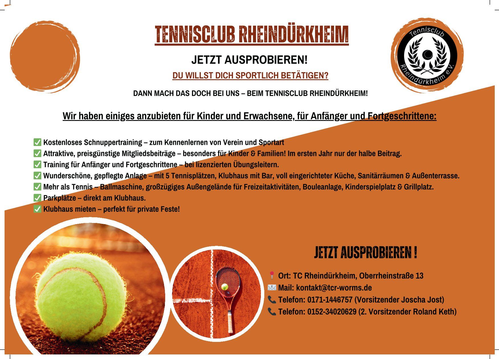 Um Kontakt zu Menschen zu bekommen, die sich für den Tennissport interessieren, wird der Verein demnächst einen Flyer in Rheindürkheimer und Ibersheimer Haushalten verteilen. Wer mal testen möchte, ob ihm oder ihr der Tennissport zusagt, kann gerne ein kostenloses Schnuppertraining vereinbaren, dabei mit Vereinsleuten ins Gespräch kommen und sich die TCR-Anlage anschauen. Wer Mitglied werden möchte, der muss bei den ohnehin sehr sozial gestaffelten Beiträgen im ersten Jahr nur die Hälfte zahlen. Wer möchte, kann Mitglied einer TCR-Mannschaft werden und sich dann an Punktspielen bei der so genannten „Medenrunde“ beteiligen. Pflicht ist das allerdings nicht, man kann auch genauso gut kommen, trainieren oder sich dosiert bewegen – ganz nach eigenem Gusto. Wer Trainerstunden nehmen möchte, kann dies bei lizensierten Übungsleitern tun – nach entsprechender Terminabsprache.